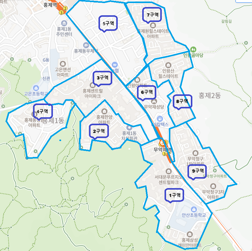 무악재 성당의 9개 구역 지도와 구역을 안내합니다.
