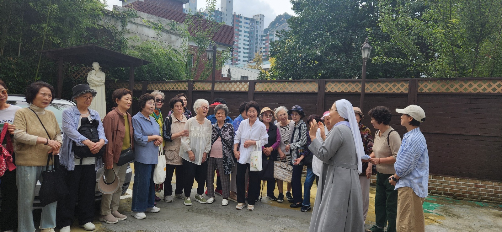 성당 마당에 모여 기도 하고 출발~!