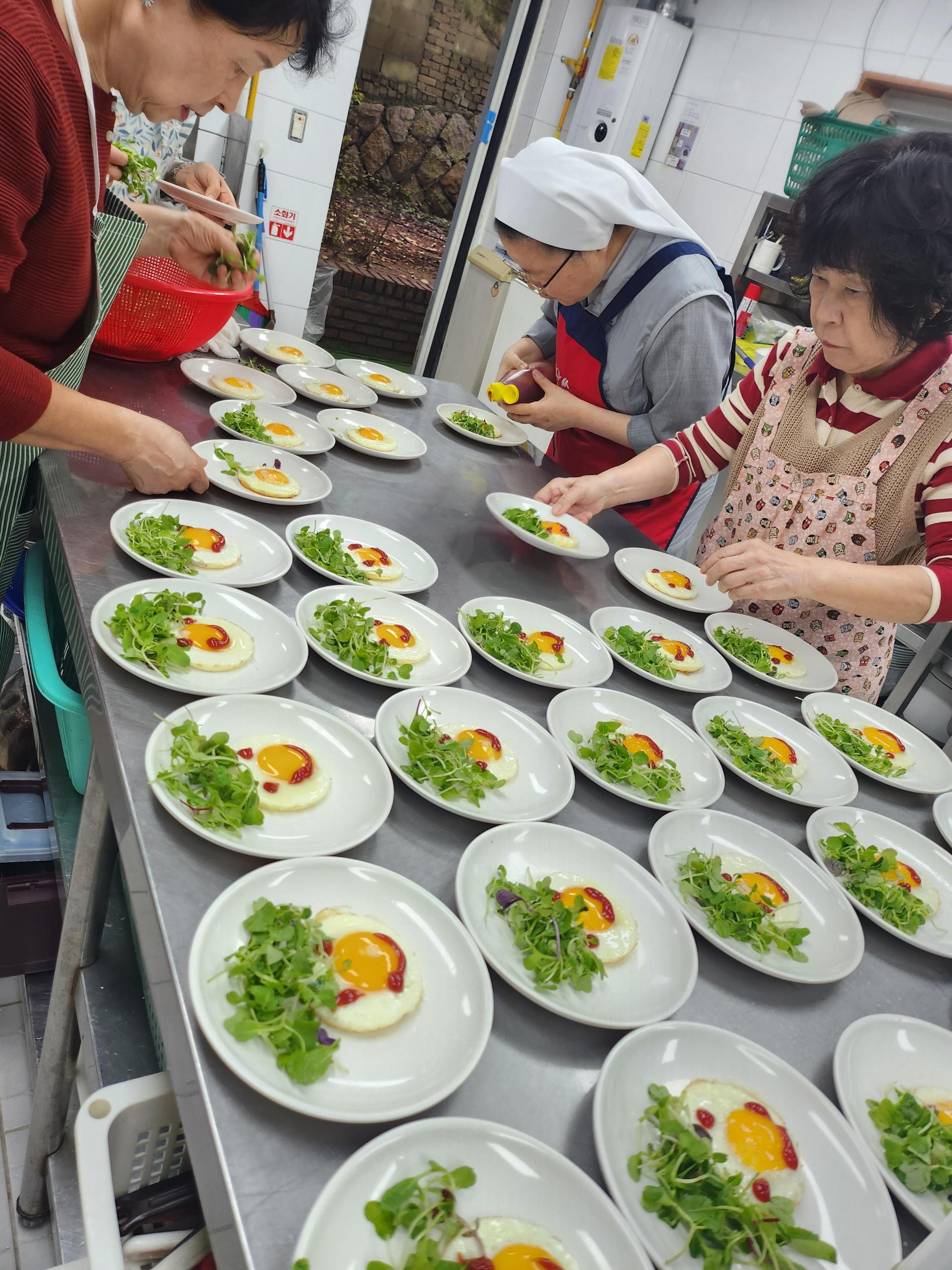 정성껏 식사를 준비하고 계신 안비아 수녀님과 봉사자분들^^ 달걀후라이로 웃는 얼굴을 표현하셨네요^^