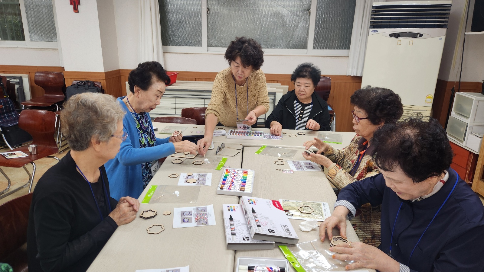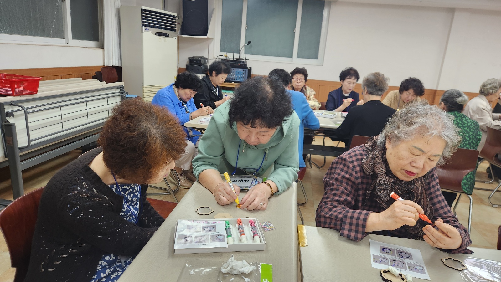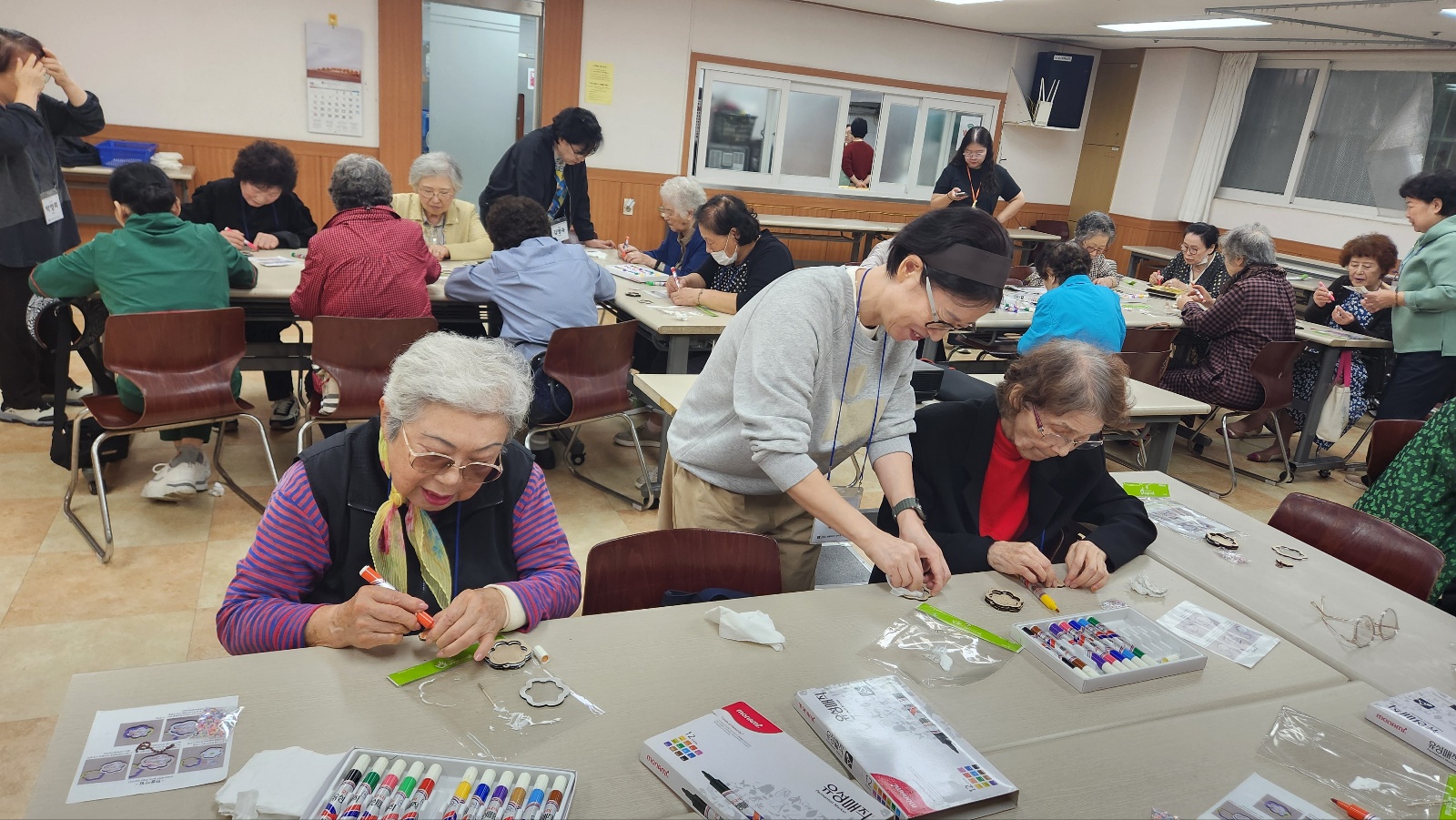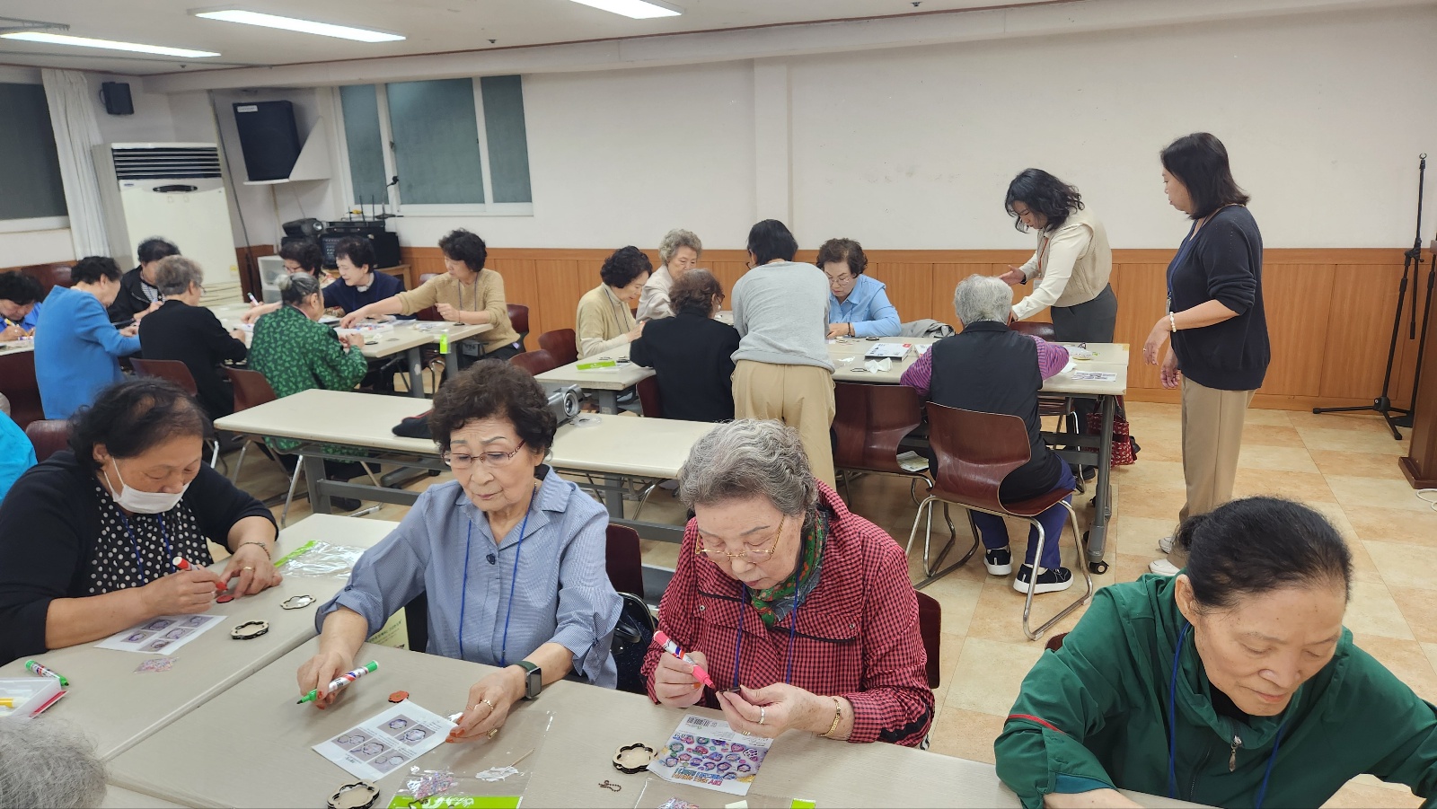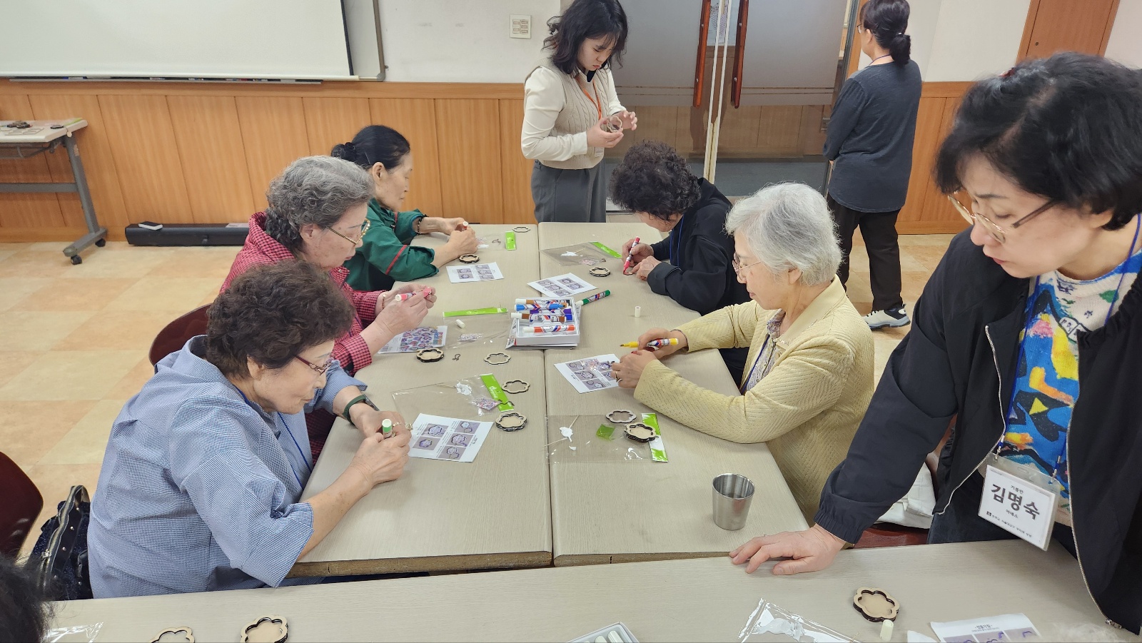 치매안심센터 담당자님 두분과 학장님, 교사님들의 지도로 열쇠고리 도안작업 및 색칠작업 중이예요^^
