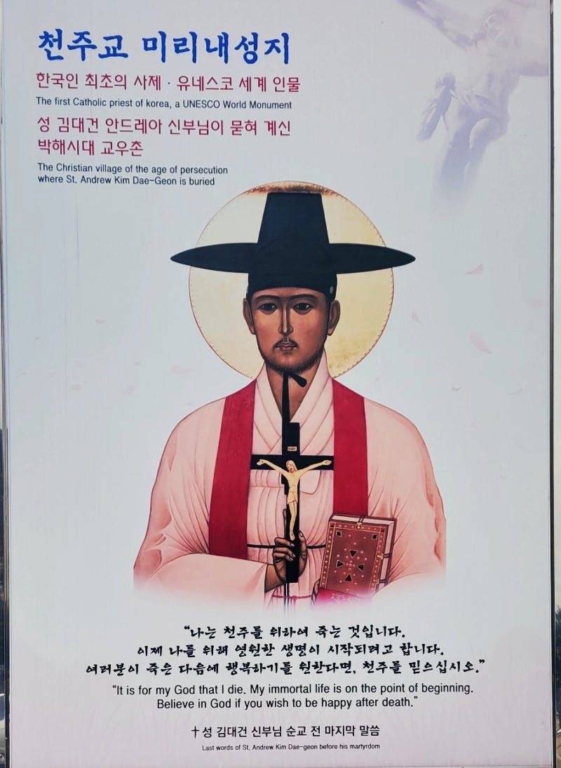 성 김대건 안드레아 신부님은 5천리 걸어 마카오에서 신학 공부를 하셨고 중국인으로 위장, 조기잡이 배를 타고 백령도로 들어오다 8번의 칼날에 목이 잘려 효시당했다고 합니다. 15개국 200여곳에 김대건 신부님의 성당이 지어져 있다하니 그 영향력이 실로 어마어마한 것 같네요.