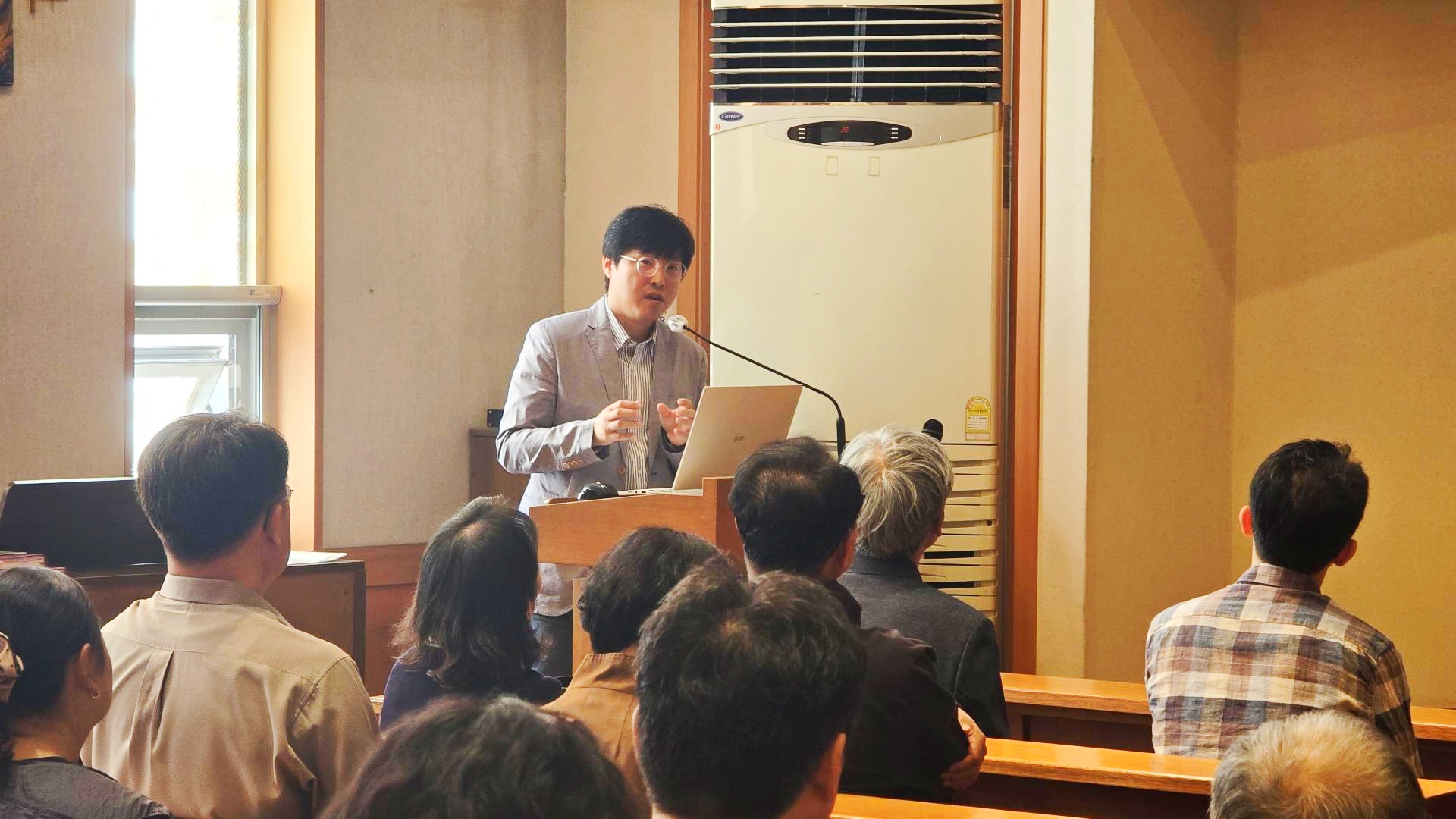 미리내성지에 대해 해설해 주고 계시는 해설사님